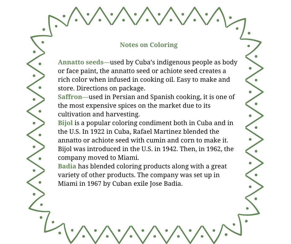 Make a normal sofrito (onion, green bell pepper, red pepper, garlic, tomato sauce, pimiento-stuffed olives). Need quartered white potatoes and chicken pieces. Decide on coloring ingredient.